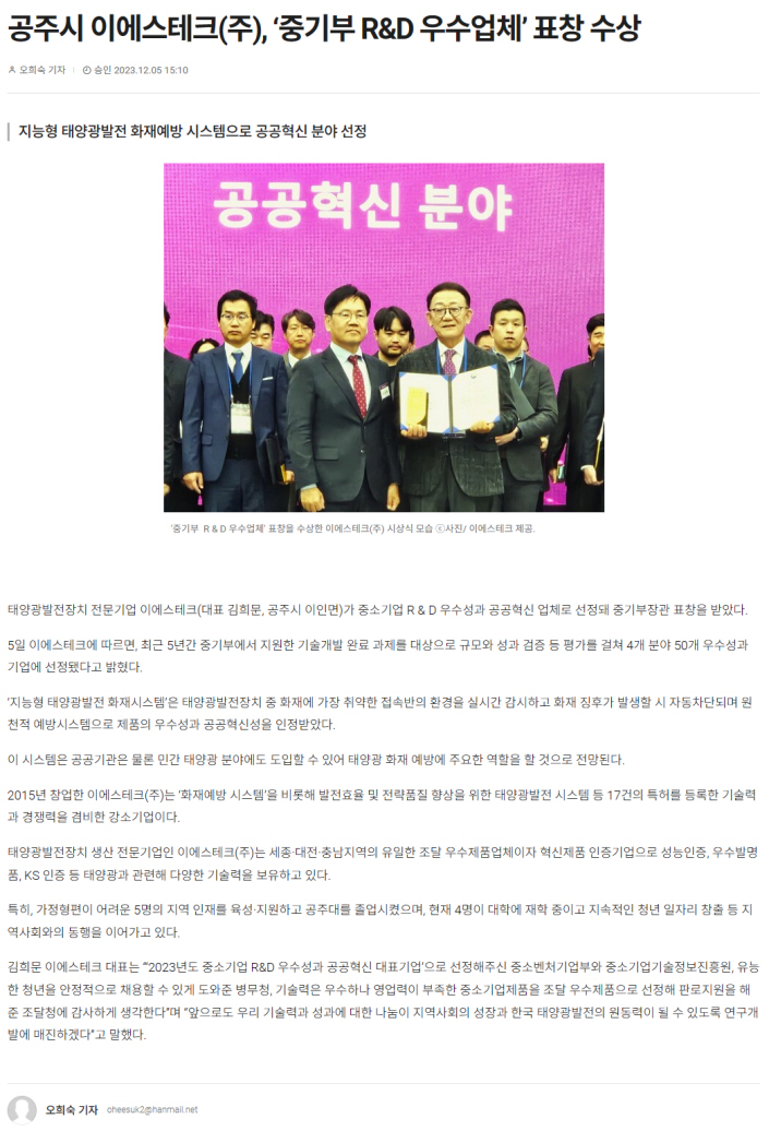 [파워뉴스] 공주시 이에스테크(주), ‘중기부 R&D 우수업체’ 표창 수상