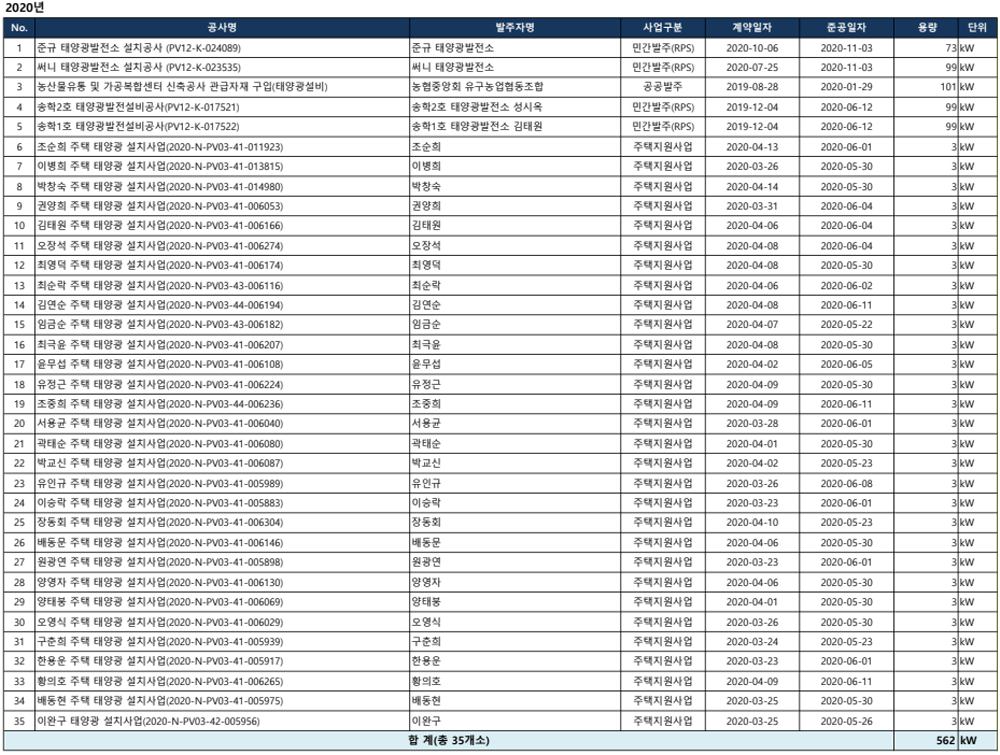 [2020] 35개소 562kW 매출액 24억원